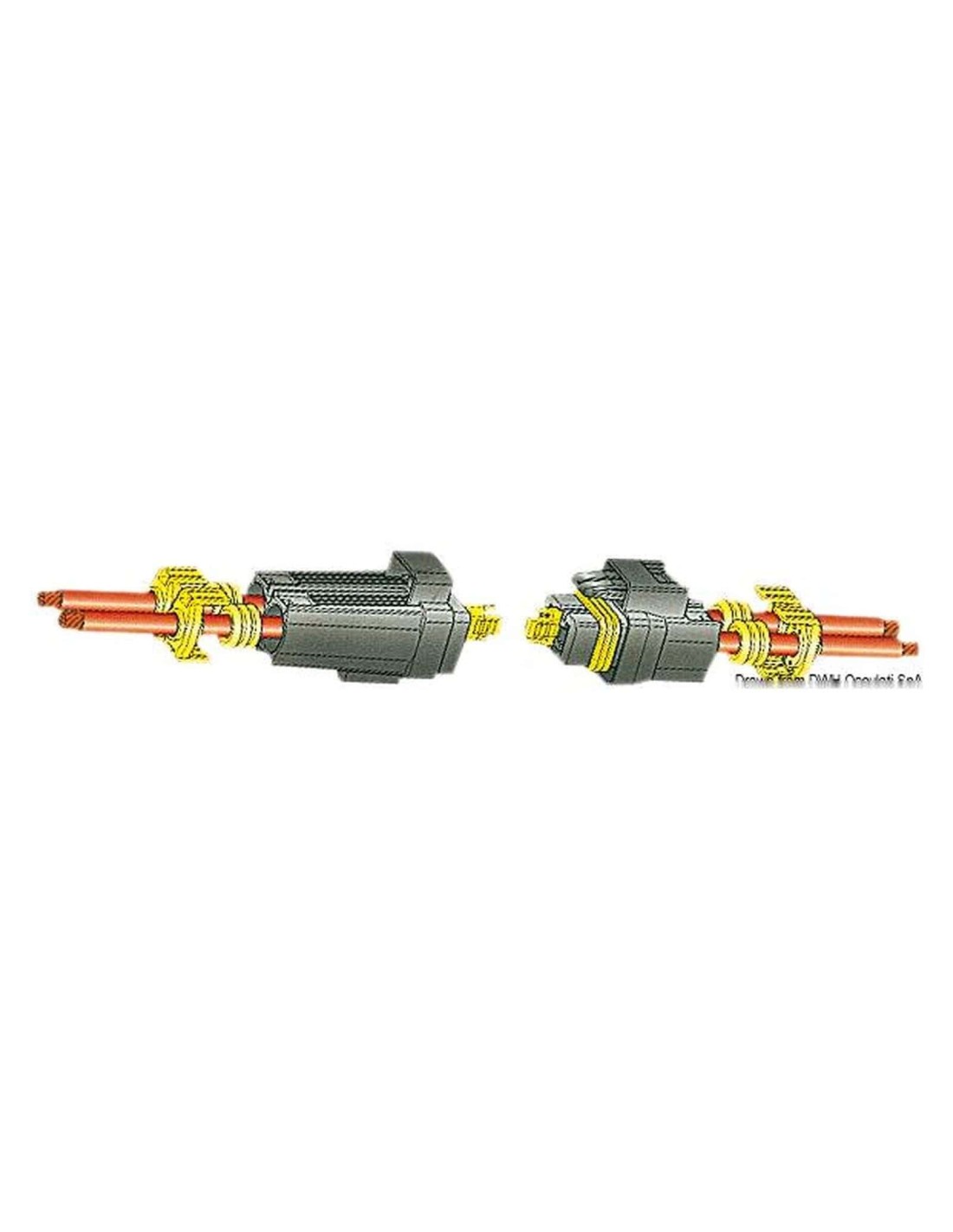 Un connettore completo viene formato da: connettore + 2 faston maschi 14.231.20/40 + 2 faston femmina 14.231.0/30 + 4 tasselli con guarnizione della appropriata sezione 14.232.01/02.