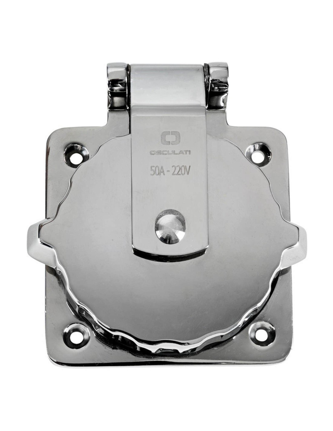 Presa: in acciaio inox AISI 316 lucidato a specchio + policarbonato + contatti in ottone nichelato e protezione posteriore uscita cavi.