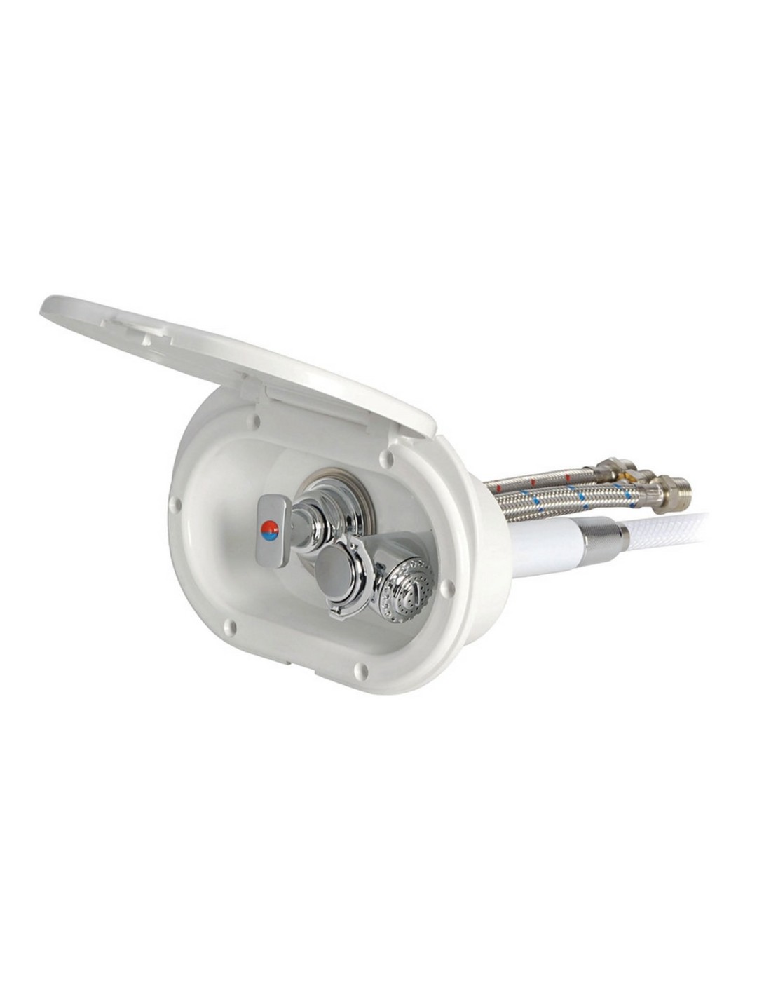 Doccia in ottone cromato, vano di alloggiamento bianco in ASA UV resistente. Completo di rubinetto miscelatore acqua calda/fredda. Montaggio in piano o a parete.
