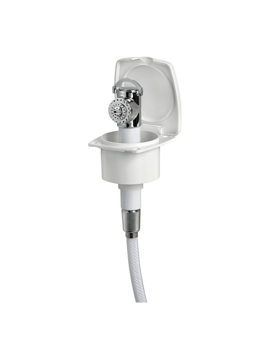 Doccia in ottone cromato, vano di alloggiamento bianco in ASA UV resistente.