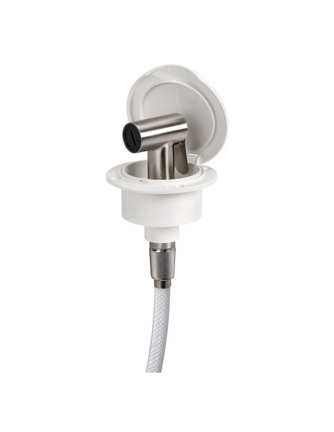 Doccia in acciaio inox, vano di alloggiamento bianco in ASA UV resistente.
