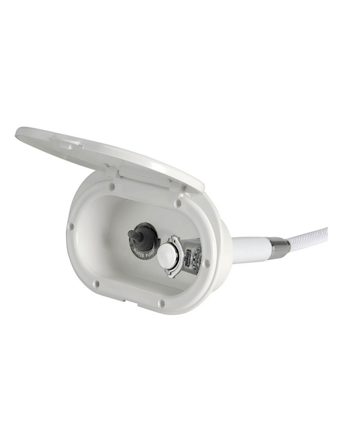 Doccia in ottone cromato, vano di alloggiamento bianco in ASA UV resistente. Da utilizzare su scafi medio-piccoli ove l'uso della doccia è direttamente correlato all'accensione dell'autoclave.