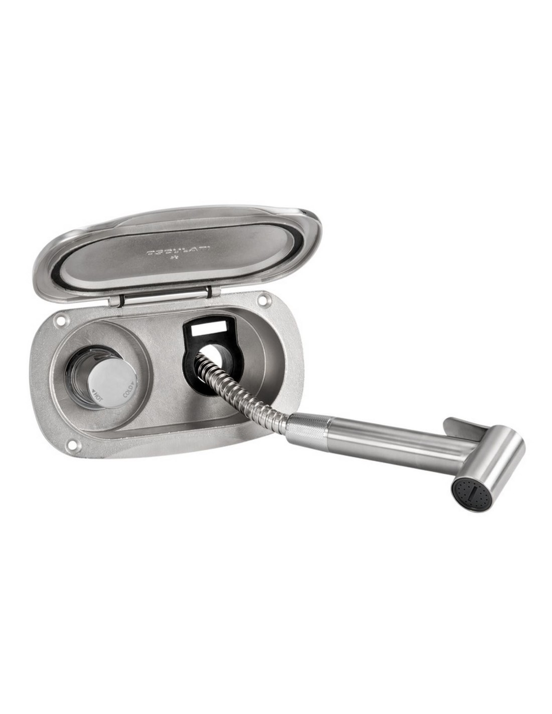 Vano doccia in acciaio inox AISI 316 con sportello autoreggente/frizionato. Doccetta Tiger in acciaio inox. Boccola interna antivibrante. Miscelatore a pomello cilindrico.