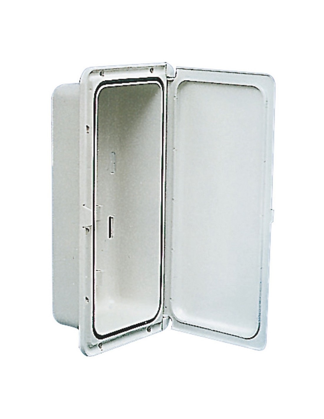 Vano in polipropilene bianco con sportello di chiusura a tenuta stagna con guarnizione in neoprene. Cornice con viti a scomparsa, coperchio in policarbonato bianco resistente UV.