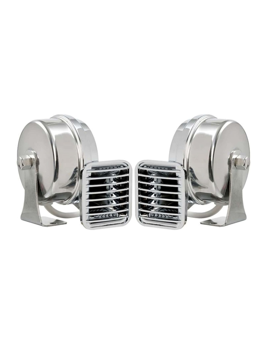 Corpo in ABS cromato con supporto in acciaio inox lucidato a specchio. Potenza singola tromba 115 + - 5 dB.