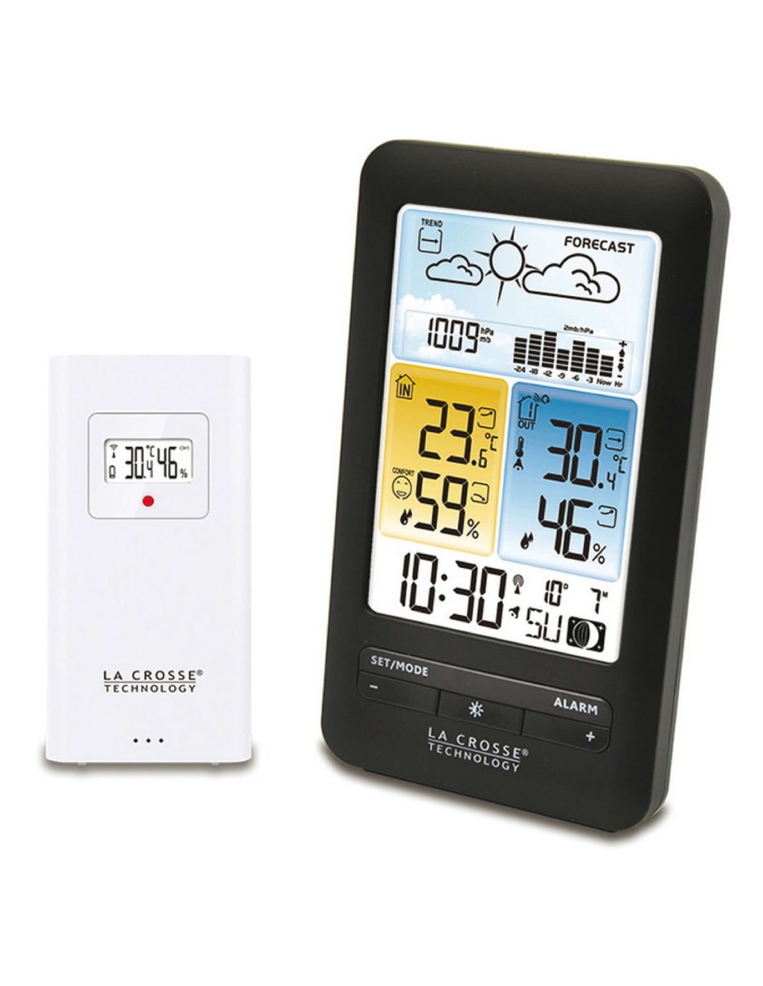 - Temperatura interna/esterna e umidità interna/esterna con tendenze + memoria minime e massime;