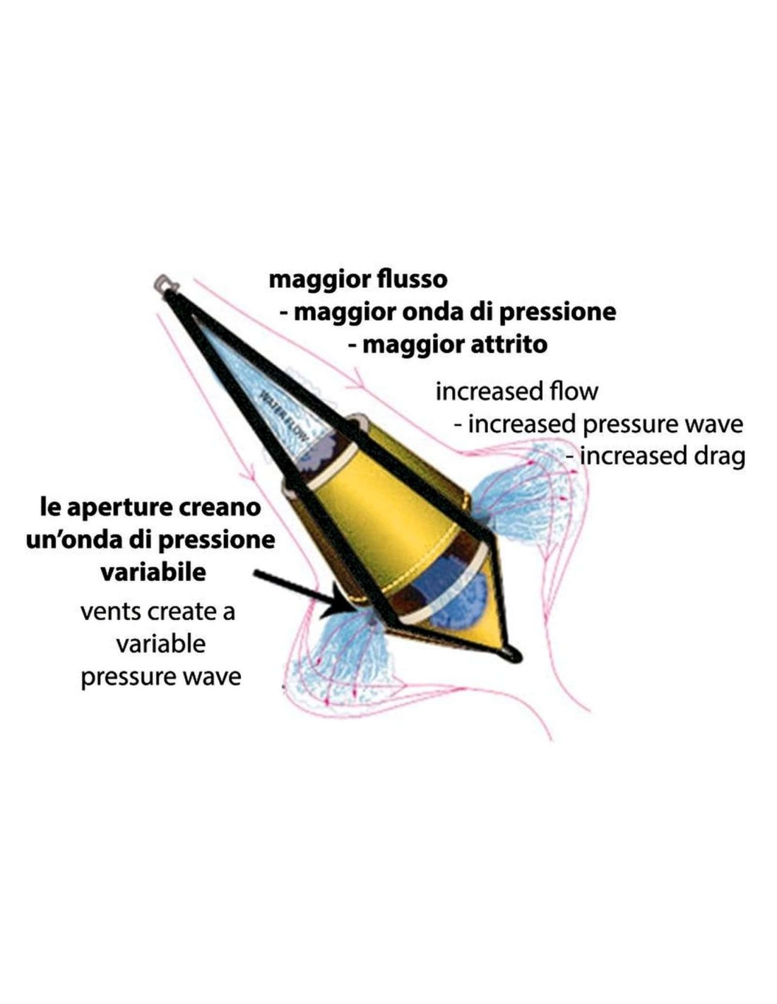 Costruita con materiali resistentissimi, il profilo a doppio cono crea una particolare turbolenza che aumenta l'efficacia del "Seabrake" all'aumentare della forza del mare. L'acqua fuoriesce dai 4 scarichi alla base, mantenendo costante l'assetto. Nove possibili usi: 1) ancora galleggiante; 2) ancora anti planata, riduce il rischio di straorzare e di planata; 3) anti rollio in rada; 4) virate di emergenza; 5) stabilizza la barca al traino; 6) ancora e deriva; 7) freno; 8) stabilizzatore; 9) timone di emergenza. Fornita con sacca.