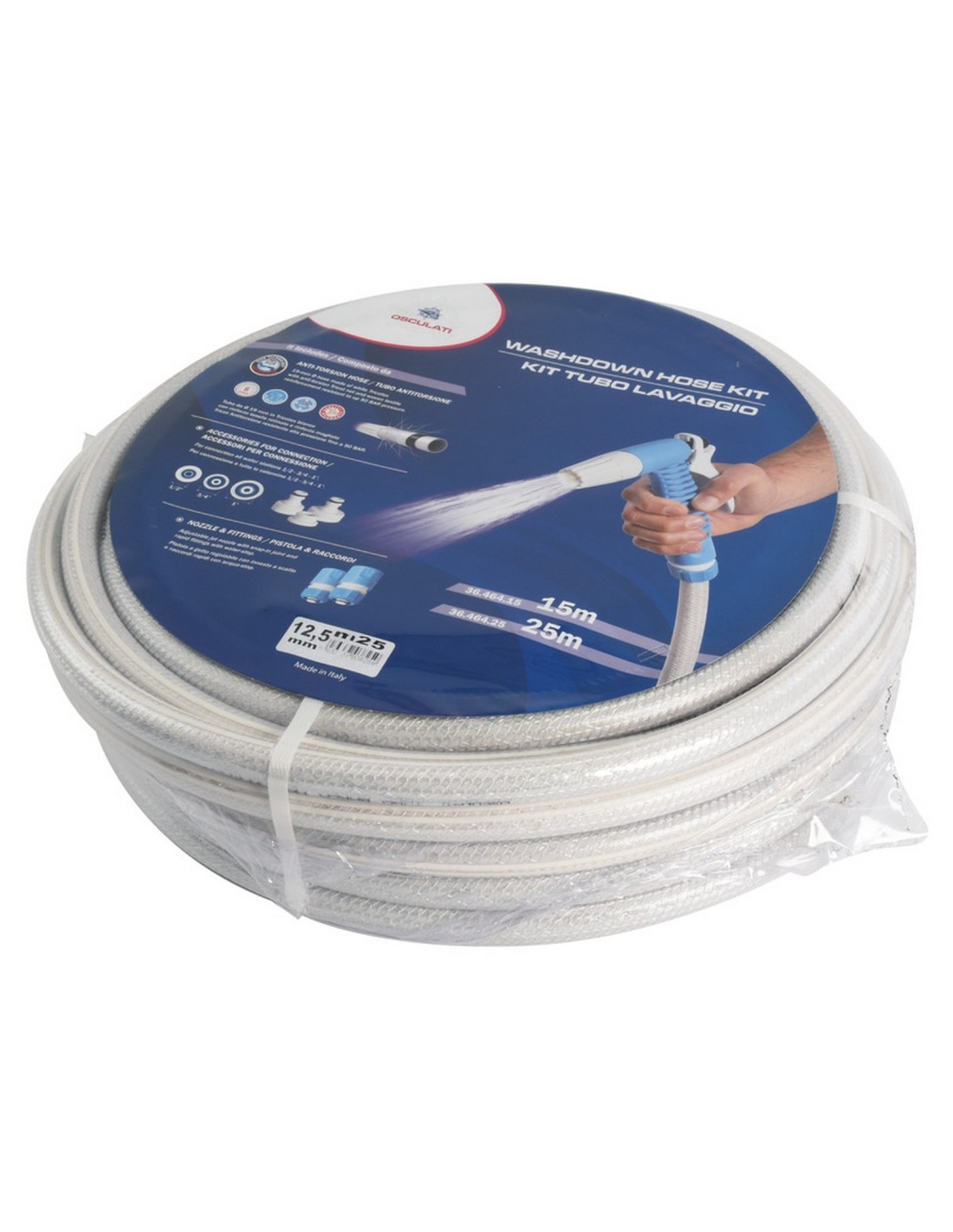 Composto da tubo da Ø 19 mm in Tricotex bianco con rinforzo tessile retinato e rinforzo magliato Tricot Antitorsione, resistente alla pressione fino a 15 BAR + pistola a getto regolabile con innesto a scatto e raccordi rapidi acqua-stop + 3 accessori per connessione a tutte le colonnine.