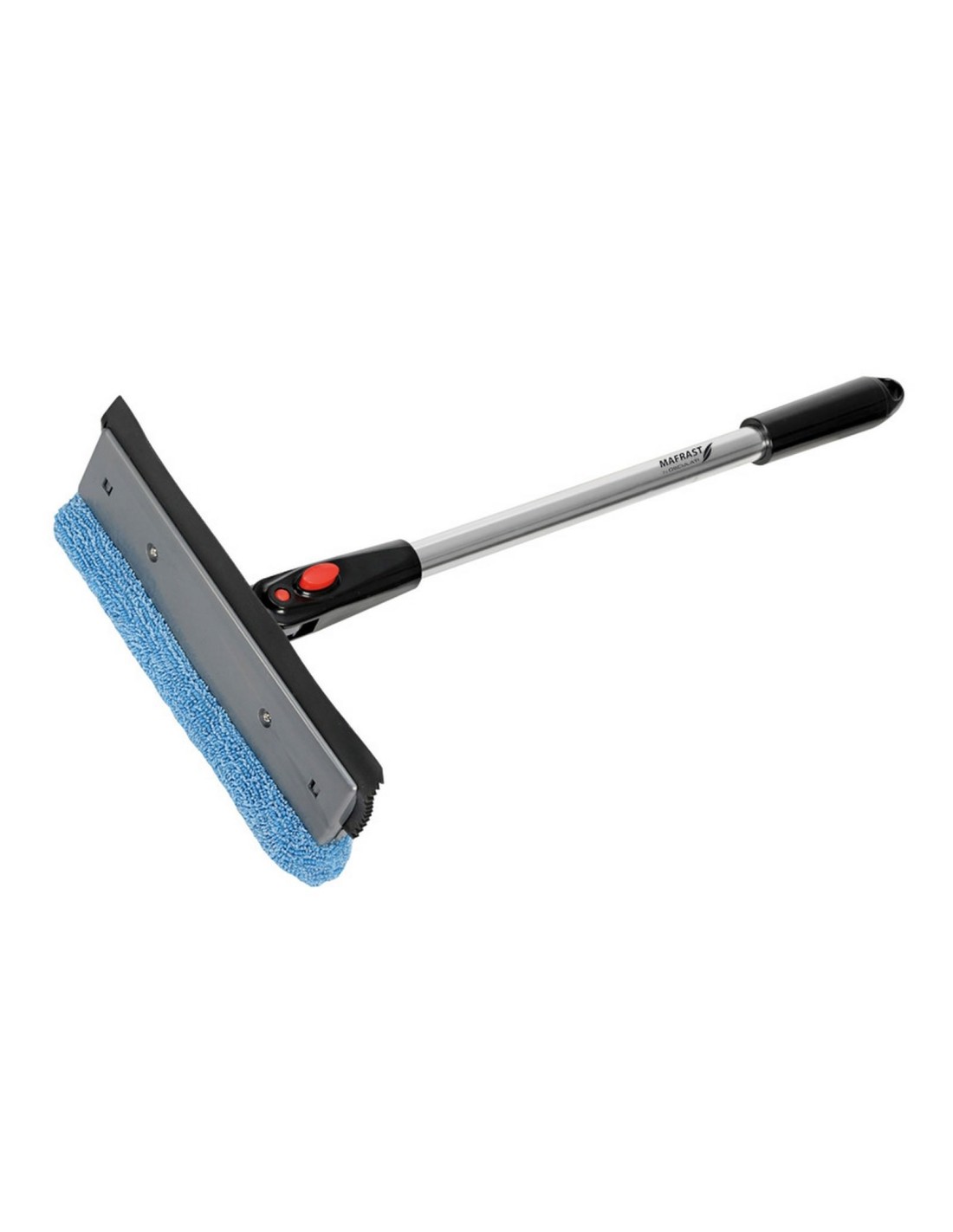 Attrezzo con spazzola in microfibra + lama di asciugatura. Completo di manico pieghevole in alluminio anodizzato.