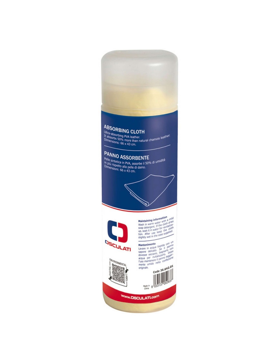 Pelle sintetica ultra-assorbente in PVA. Assorbe il 50% in più della pelle di daino animale, asciugando perfettamente, senza lasciare aloni.