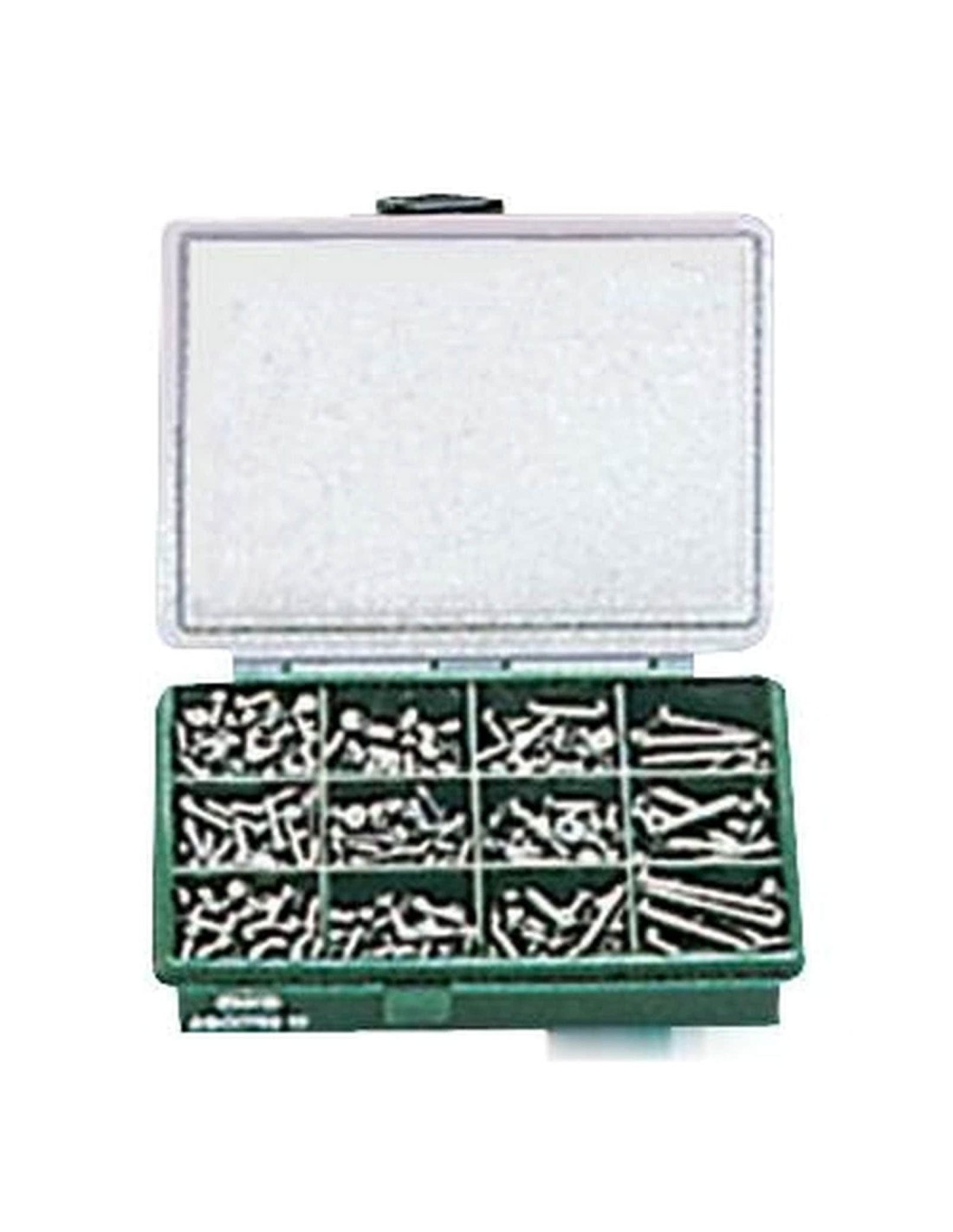 Misure: A2 AISI 304 175x145x32 mm. Totale pezzi: 390. Contenuto: 46 viti testa esagonale (DIN 933); 64 viti testa svasata piana (DIN 963); 90 dadi esagonali (DIN 934); 40 dadi esagonali autobloccanti (DIN 982); 90 rondelle piane (DIN 125); 60 rondelle piane larghe tre volte il foro.