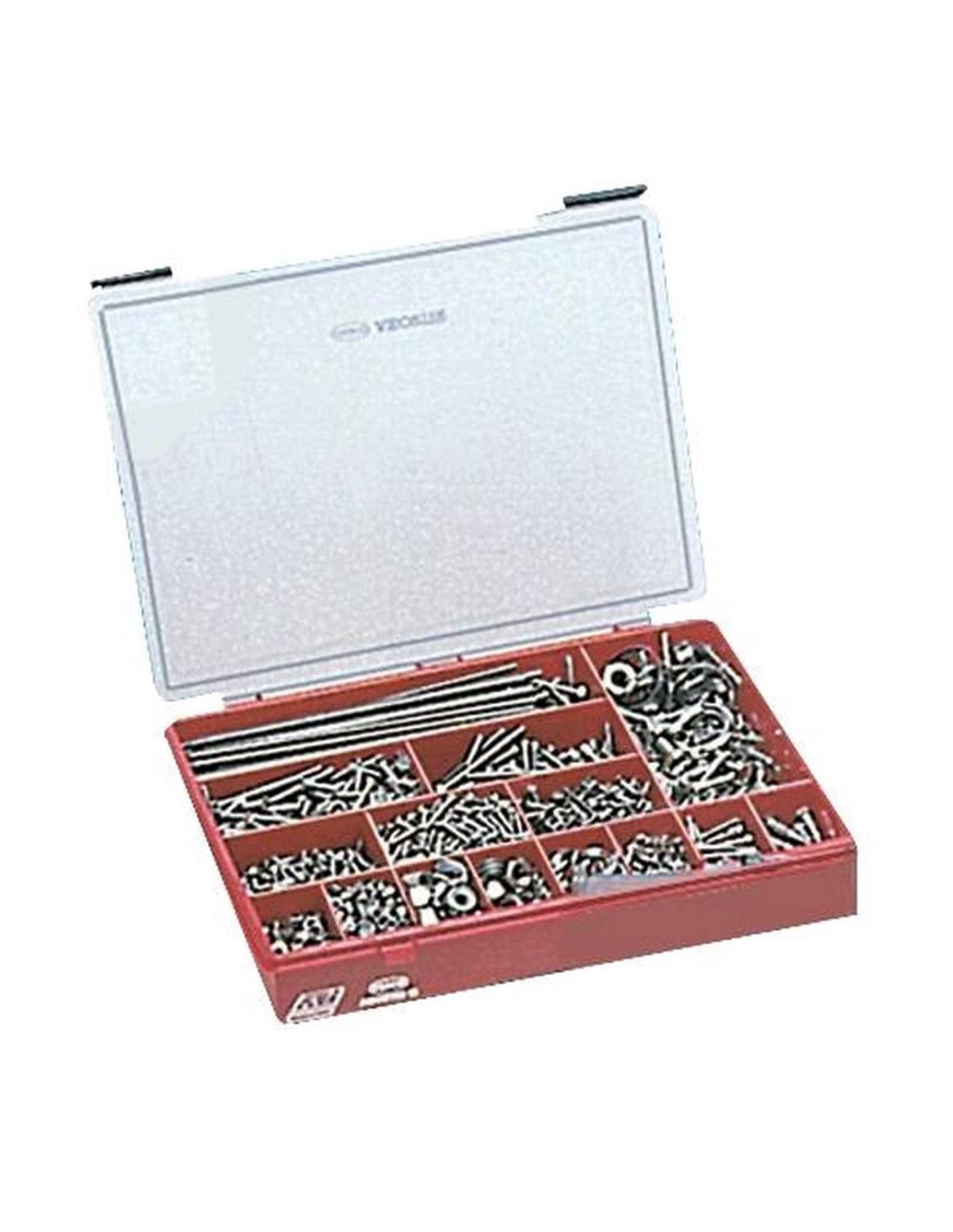 Contenuto: 192 viti autofilettanti (DIN 7981); 200 viti autofilettanti (DIN 7983); 168 viti Fastar, testa svasata piana, taglio a croce; 16 tirafondi (DIN 571); 138 viti testa esagonale (DIN 933); 129 viti testa svasata piana (DIN 963); 124 viti testa cilindrica (DIN 84); 42 viti testa cilindrica con cava esagonale (DIN 912); 240 dadi esagonali (DIN 934); 71 dadi autobloccanti (DIN 982); 17 dadi ciechi (DIN 1587); 20 galletti (DIN 315); 215 rondelle (DIN 125); 130 rondelle piane larghe tre volte il foro - 70 rondelle dentellate (DIN 6798); 90 rondelle grower (DIN 127); 15 spezzoni da 20 cm. cd. di barra filettata (DIN 975); 48 copiglie (DIN 94); 38 rivetti inox; 30 pezzi di minuteria varia inox: fascette, morsetti stringicavo, pernetti con anellino, chiave aprigrilli.