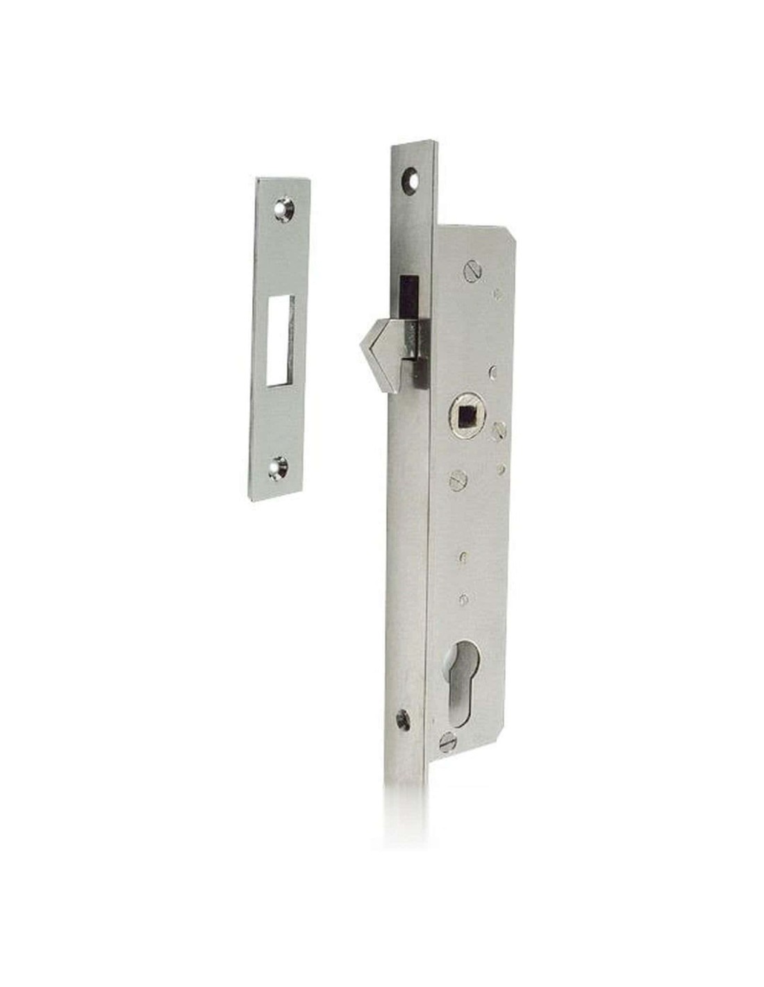 In acciaio inox. Completa di scontro, cilindro tipo Yale e maniglia piatta. La bassa profondità la rende molto adatta per porte con profili sottili.