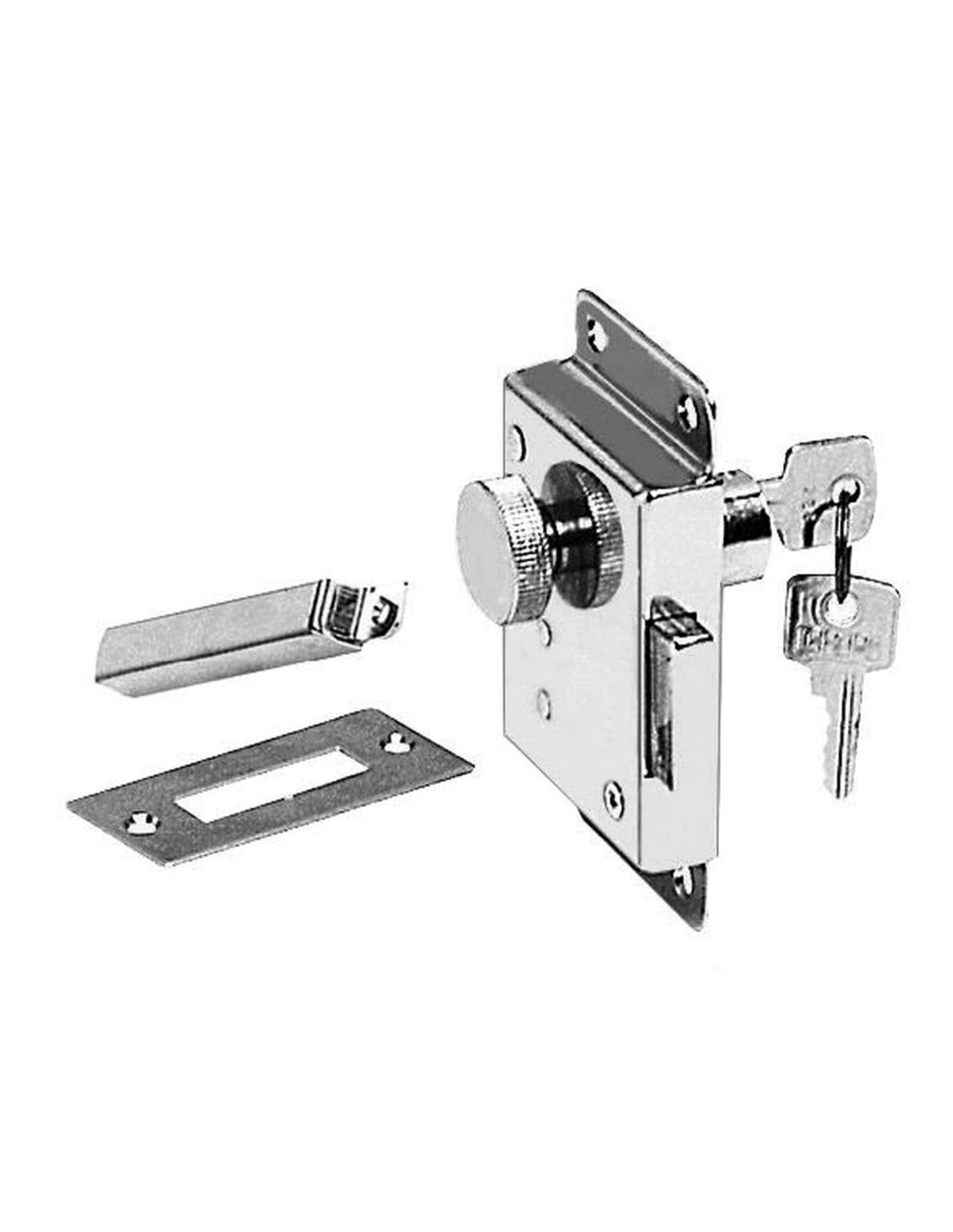 In ottone cromato da appoggiare, con chiave a cilindro dall’esterno e pomolo dall’interno. E’ una serratura molto pratica, adatta per porte, completa di scontro a cassetta.