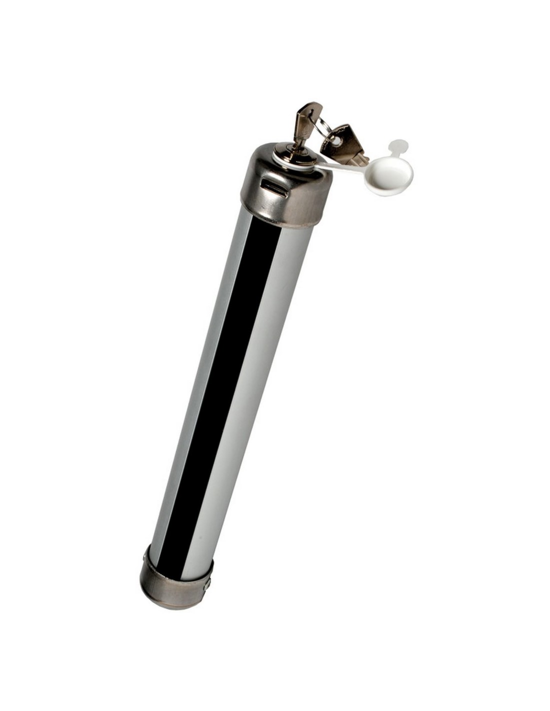 Blocca i galletti per cui: evita che si possano svitare e che il motore cada in acqua; evita il furto del motore, in quanto per poterlo spostare occorre scassinare il Sicur Loch. E’ realizzato tutto in alluminio anodizzato (spessore tubo 4 mm , quindi robustissimo), serratura di bloccaggio in ottone e acciaio inox con doppia chiave. Per il suo robusto aspetto scoraggia qualsiasi ladro. Modello "Compact” con cappucci terminali in acciaio inox e tubo interno in mousse antivibrante.