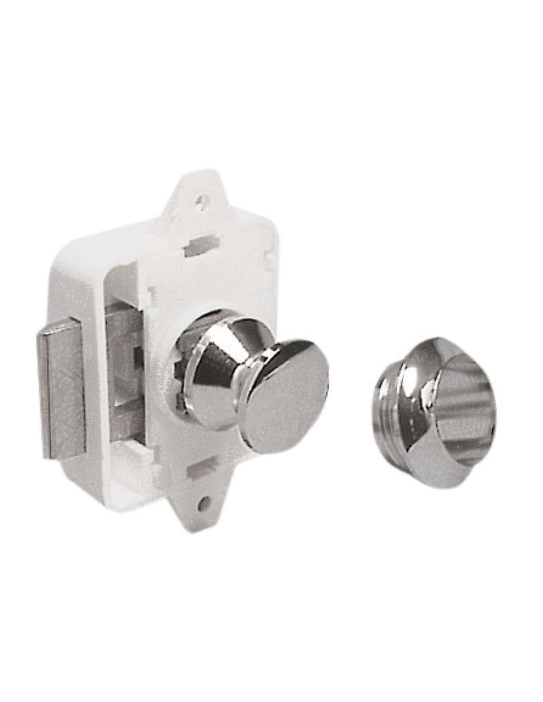Per chiudere si preme il pulsante che resta a filo, per aprire si ripreme il pulsante che esce sbloccando le antine e costituendo nello stesso tempo un pomello di presa. Montaggio dello scrocco con 2 viti e della ghiera dall’esterno con un foro Ø 26 mm. Corpo scrocco in nylon, molle inox.