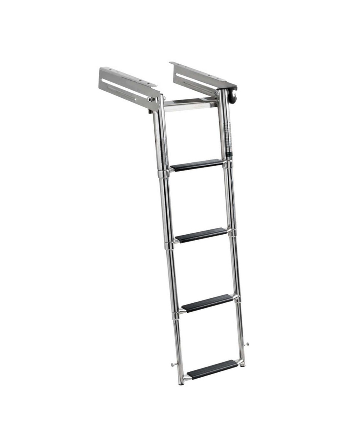 Scaletta a scomparsa con 4 gradini rettangolari in plastica nera.