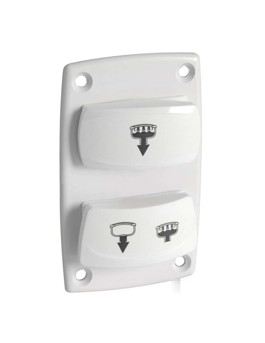 Pannello di comando manuale per WC SILENT serie 50.212.xx / 50.216.xx / 50.213.xx /50.218.xx / 50.215.xx. Realizzato per chi desidera un sistema di controllo semplice e resistente. Equipaggiato con interruttori stagni CARLINGSWITCH. Un pulsante a doppia funzione: immette acqua in posizione 1 e la scarica in posizione 2. Il secondo pulsante carica e scarica contemporaneamente e serve come lavaggio finale.