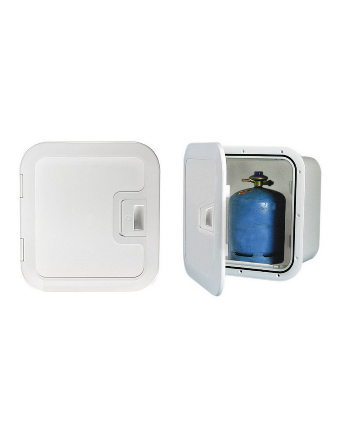 Per bombole da kg 3 con relativo regolatore di pressione. Sportello in Luran anti raggi UV. Completo di raccordo stagno per tubo gas. In accordo alla ISO 10239. Ventilazione del vano integrata nel portello. Apertura a destra come in foto; è possibile realizzare l'apertura a sinistra per minimo 5 pezzi.