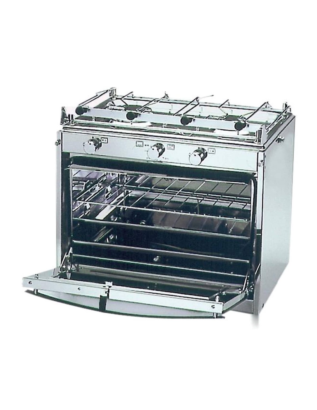 Caratteristiche: due fuochi ad altissima potenza; barretta fermapentole; supporto cardanico laterale regolabile; termocoppie di sicurezza; accensione piezoelettrica autonoma a pile incorporate; doppio cristallo anteriore a specchio; grill; termostato a regolazione infinitesimale; piano cottura di grandi dimensioni adatto a pentole da casa; bruciatore forno centrale per ottimale distribuzione del calore; doppio vassoio estraibile del forno per una facile pulizia; grande forno (900 cm2).