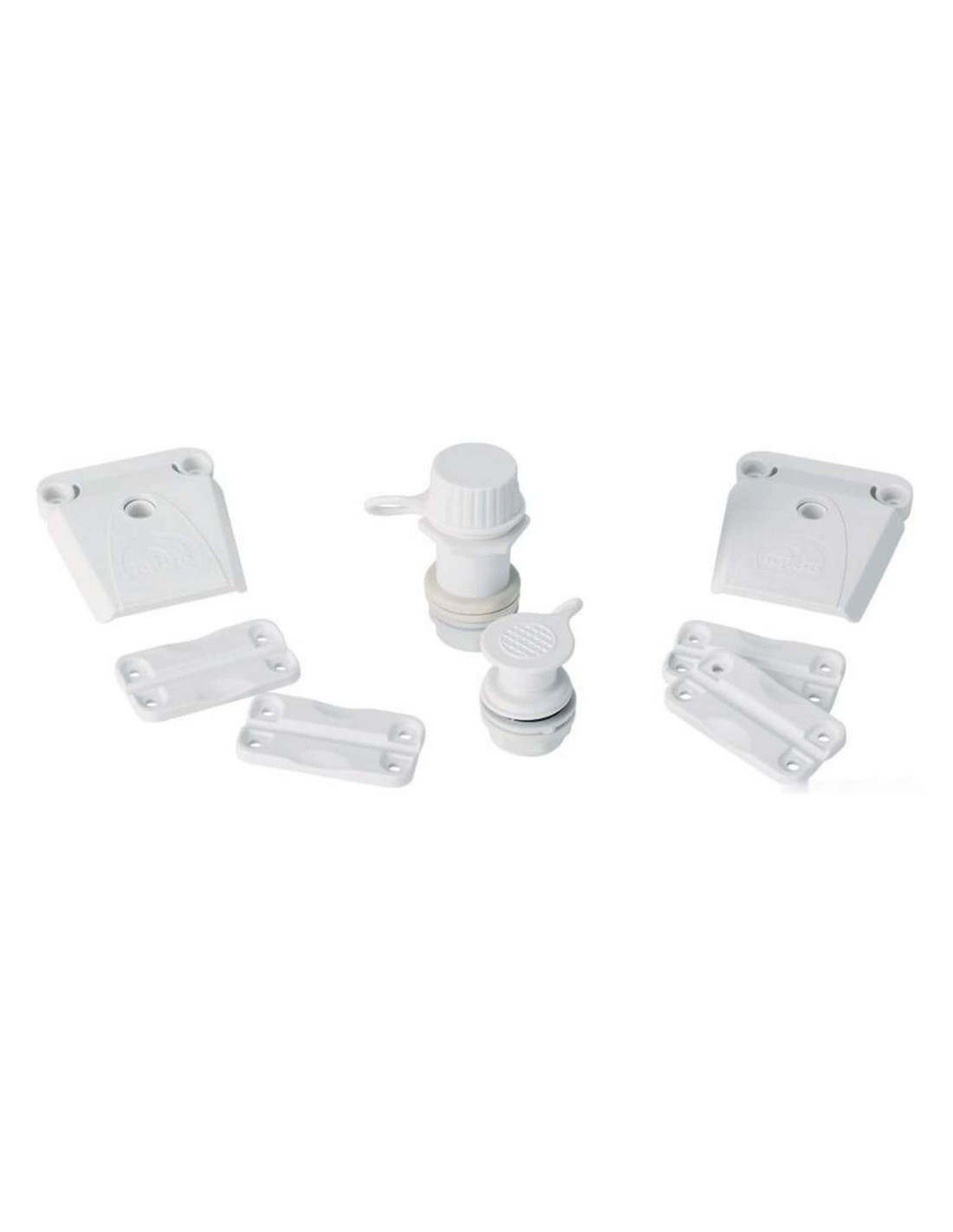 Contiene: 4 cerniere, 2 ganci chiusura, 2 tappi scarico, 24 viti inox.