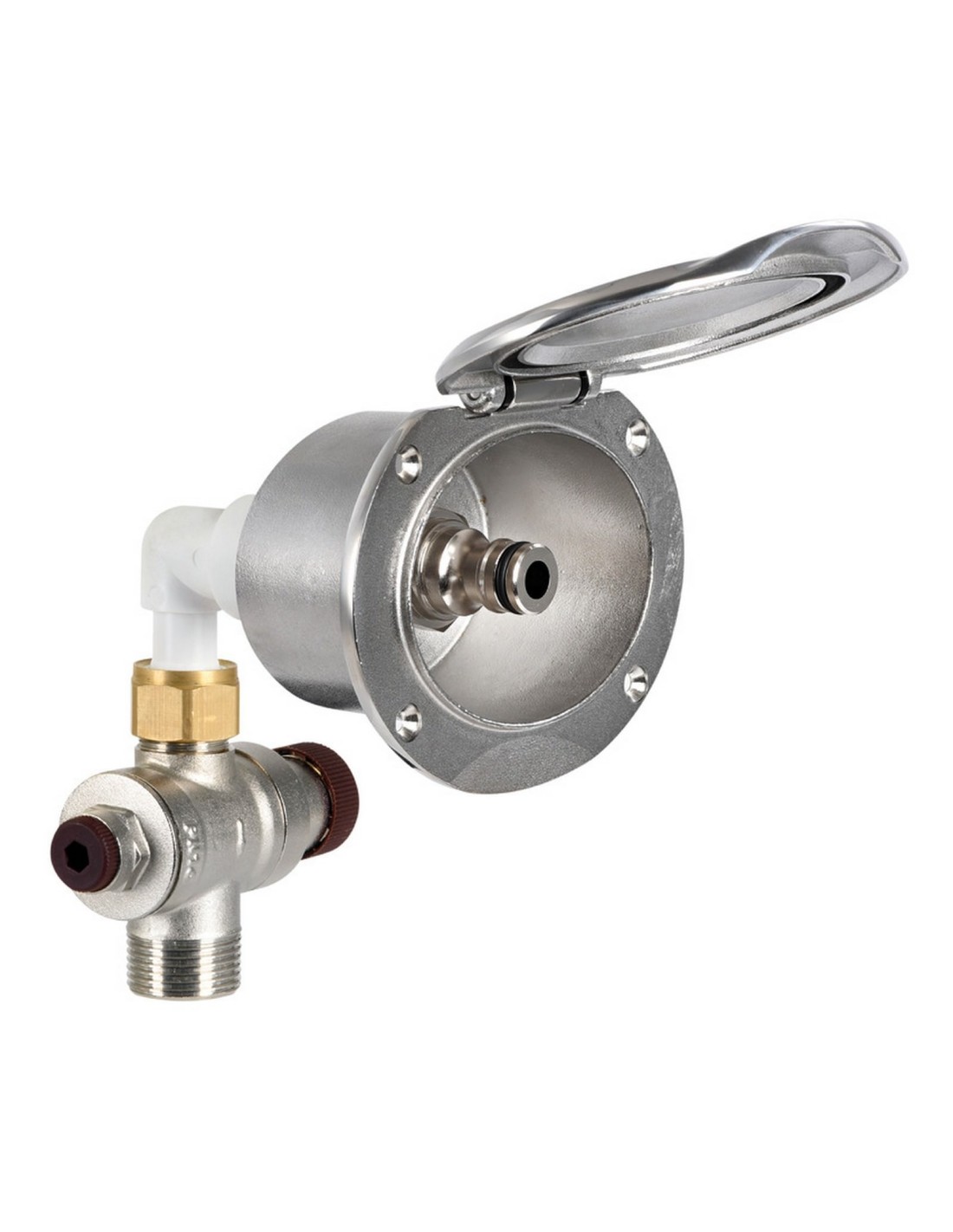 Per l'utilizzo dell'acqua di banchina, questo sistema innovativo riduce stabilmente la pressione a 3 bar, proteggendo le tubazioni da eventuali danni. Il dispositivo, compatto e dotato di regolatore di pressione e valvola di non ritorno in ottone orientabili, garantisce un flusso sicuro e costante. Il tubo per acqua di banchina si collega facilmente grazie al raccordo a scatto tipo giardinaggio (codice 36.189.02). Il filetto di uscita è 3/4" BSP. Anche se l'impianto resta collegato alla banchina, la pressione viene mantenuta stabile a 3 bar, indipendentemente dalla pressione della rete di approvvigionamento