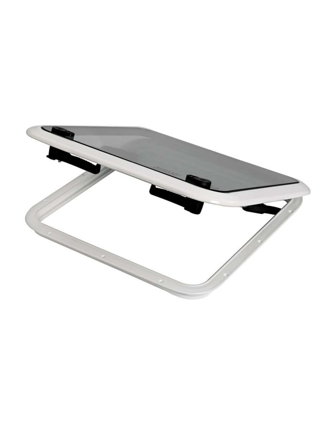 In alluminioverniciato bianco con resine epossidiche e con parte illuminante in vetro temperato fumé, omologati CE. Cerniere invisibili inserite nel profilo, apertura con fermi a compasso e posizione "ventilazione”.
