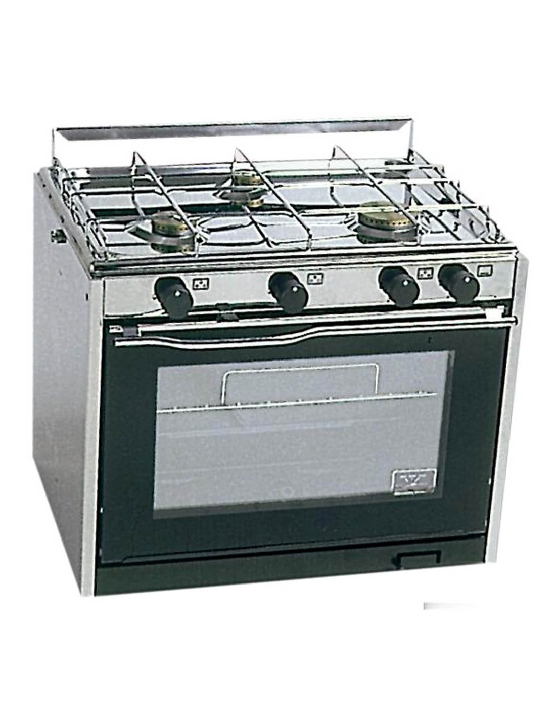 Caratteristiche: barrette fermapentole; supporto cardanico laterale; termocoppie di sicurezza; termostato; doppio cristallo anteriore; piano cottura di grandi dimensioni che accetta pentole di casa; bruciatore del forno centrale per ottimale distribuzione del calore; doppio vassoio estraibile del forno per una facile pulizia; grande forno (900 cm3).