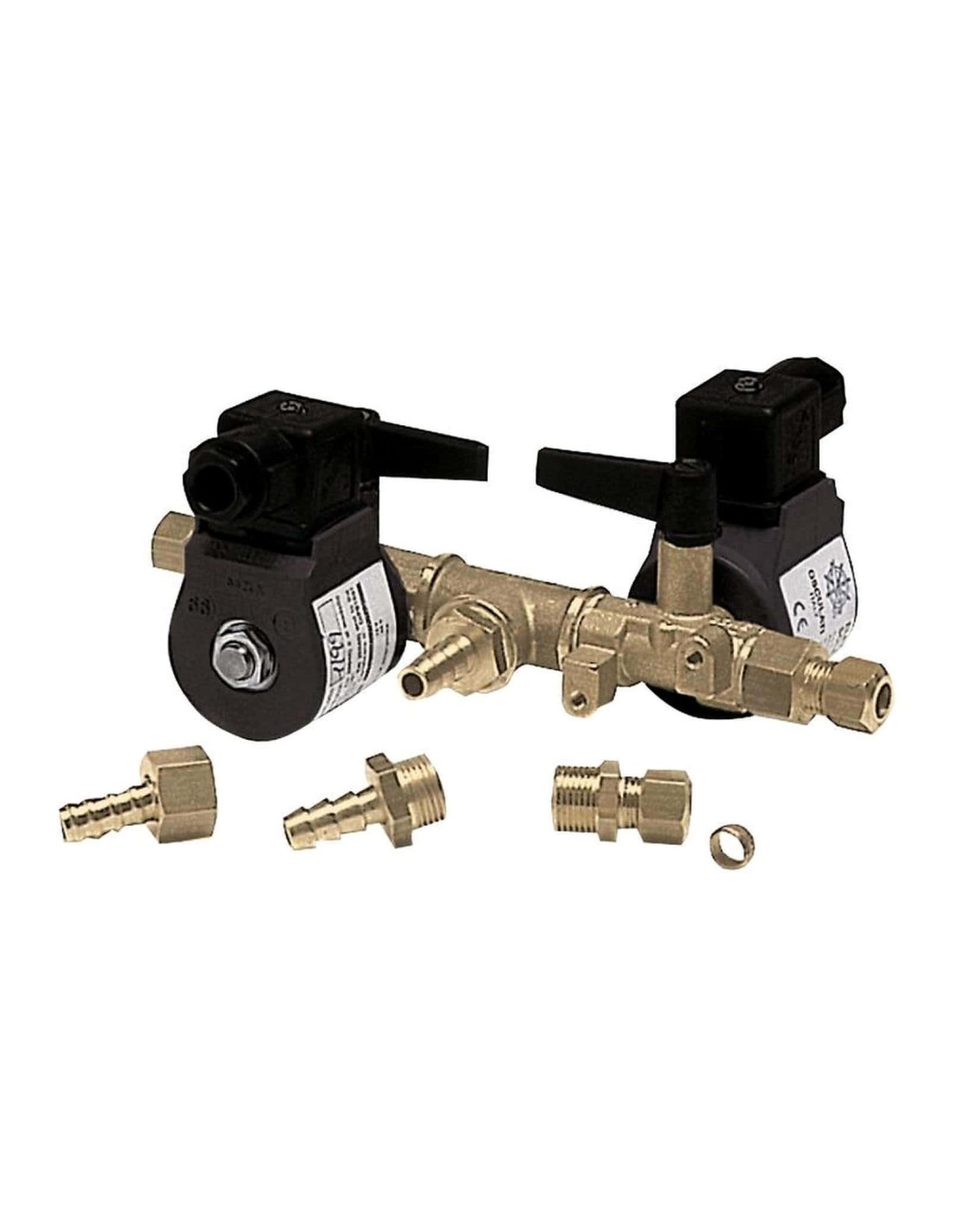 Elettrorubinetto doppio con comando a distanza più comando manuale sui rubinetti per collegare due serbatoi ad un motore