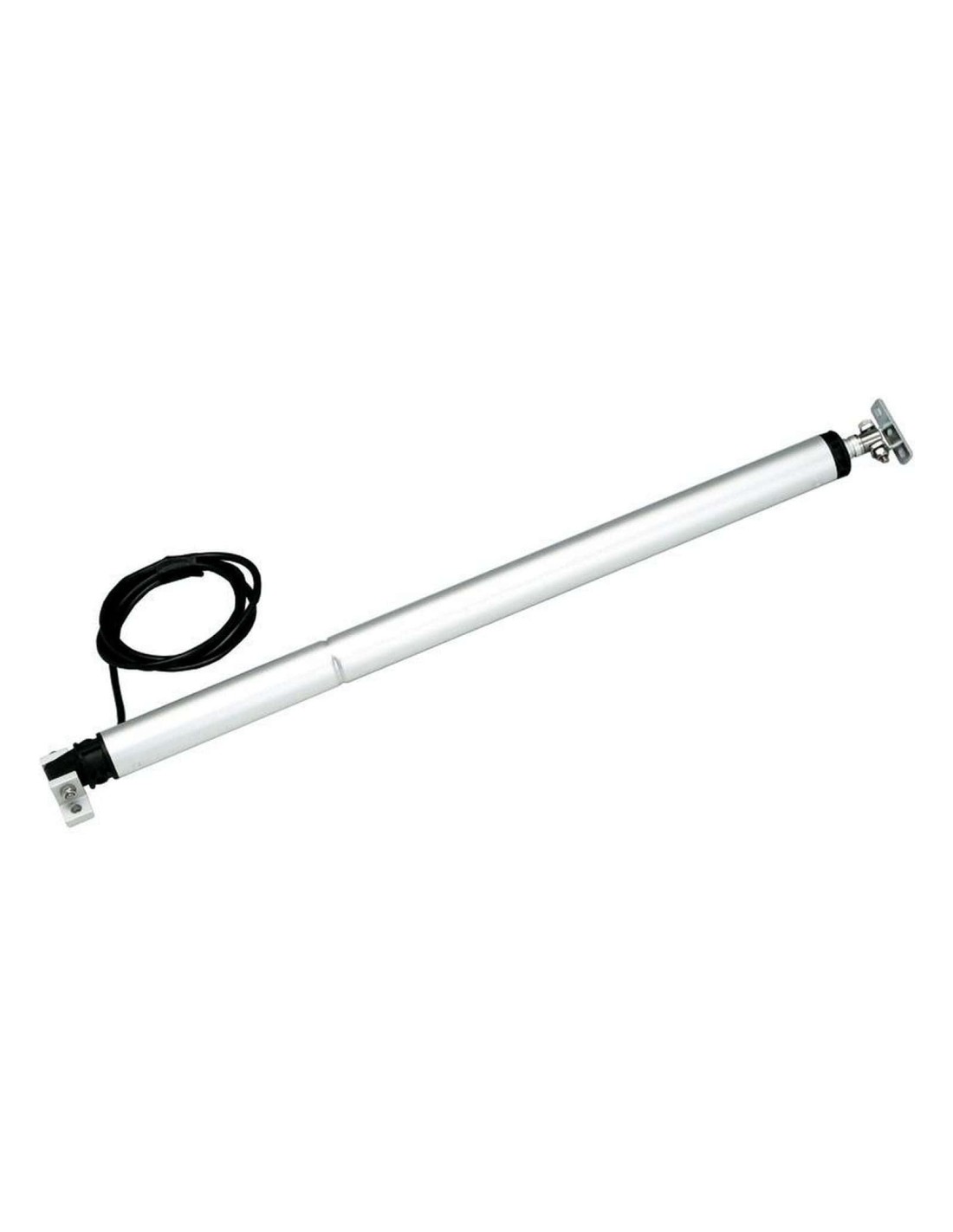 Montaggio singolo. Corpo Ø 34 mm, spinta massima 65 kg. Assorbimento 2 A a 12 V, velocità 4 mm/sec a 12 V, 6 mm/sec a 24 V. Con corpo in alluminio e stelo telescopico inox, impermeabile IP65. Apertura totale o parziale del portellone in tutte le posizioni volute.