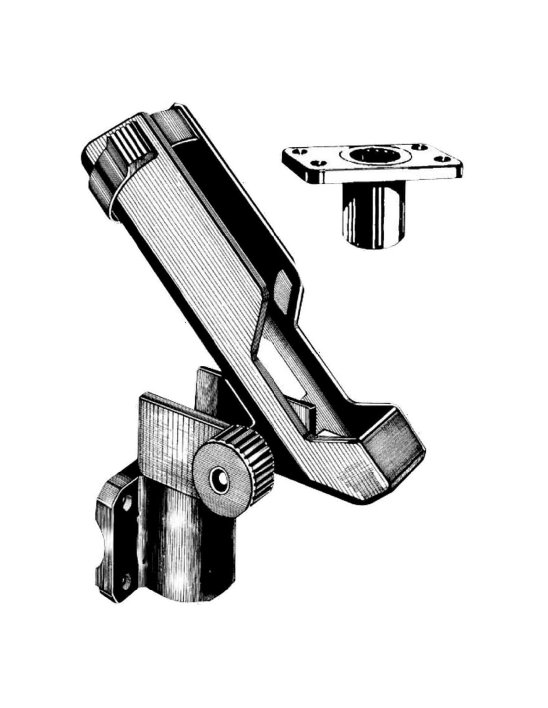 In nylon. Può ruotare ed essere bloccato per 360° in senso orizzontale e per 140° dalla orizzontale in senso verticale. La canna resta incastrata tramite il mulinello nell’apposito incavo ricavato nel portacanne. Munito di anello superiore di blocco della canna. Tutto il portacanne può essere sfilato a baionetta dalla basetta a parete.