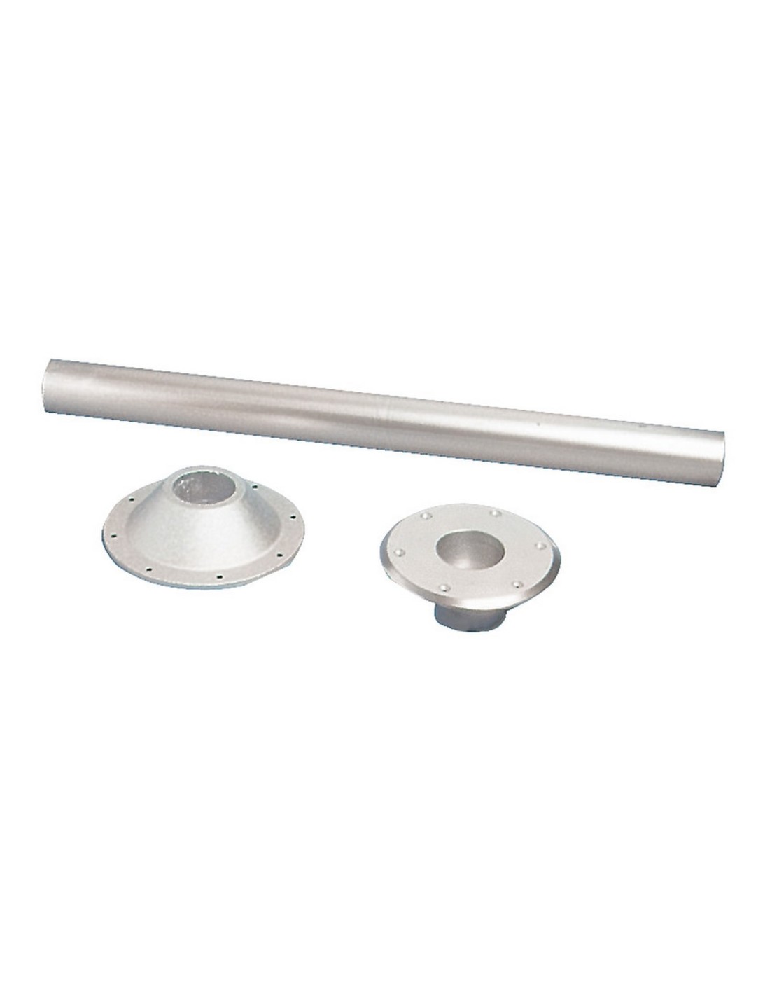 Costituita da due basi in alluminio anodizzato, una da incasso lucidata a specchio, l’altra esterna, più un tubo in alluminio anodizzato del Ø di 60 mm, munita di innesti conici.